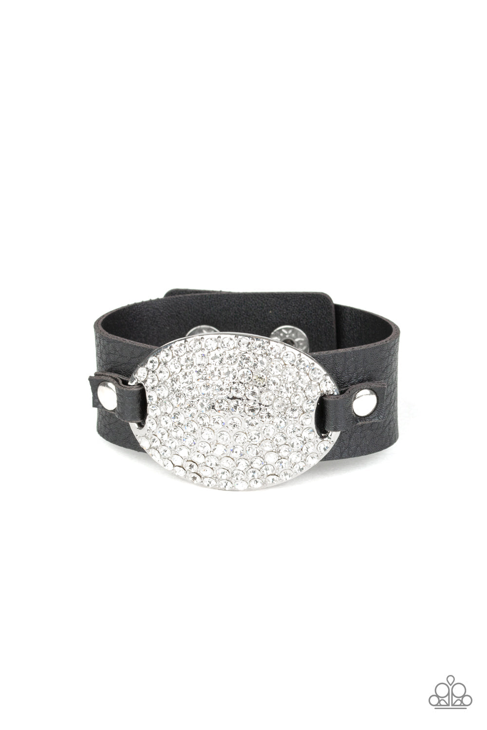 Countless white rhinestones are encrusted across the front of a dramatic silver frame that has been studded in place across the center of a black leather band for a blinding look. Features an adjustable snap closure.