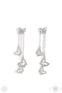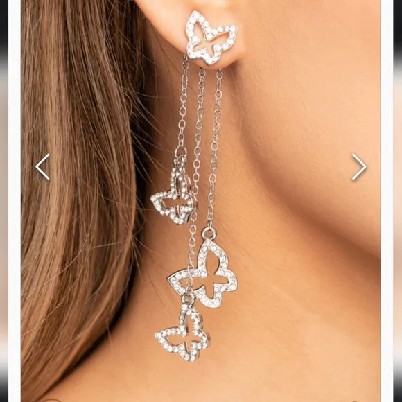 Cascading from a solitaire, rhinestone-encrusted butterfly, a trio of butterfly silhouettes in varying sizes with a similar sparkle attaches to a double-sided post as it cascades from dainty silver chains for an eye-catching flutter below the ear. Earring attaches to a standard post fitting.