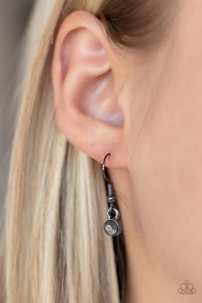 An airy hematite encrusted triangular frame is pressed into a gunmetal ring adorned in a purple shell-like frame. The colorful pendant swings from the bottom of a classic gunmetal chain, creating a modern display. Features an adjustable clasp closure.