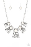 Rippling with hammered details, flared silver frames join below the collar, creating a fierce fringe. Refreshing white stones are pressed into the tops of the frames for a colorful finish. Features an adjustable clasp closure.