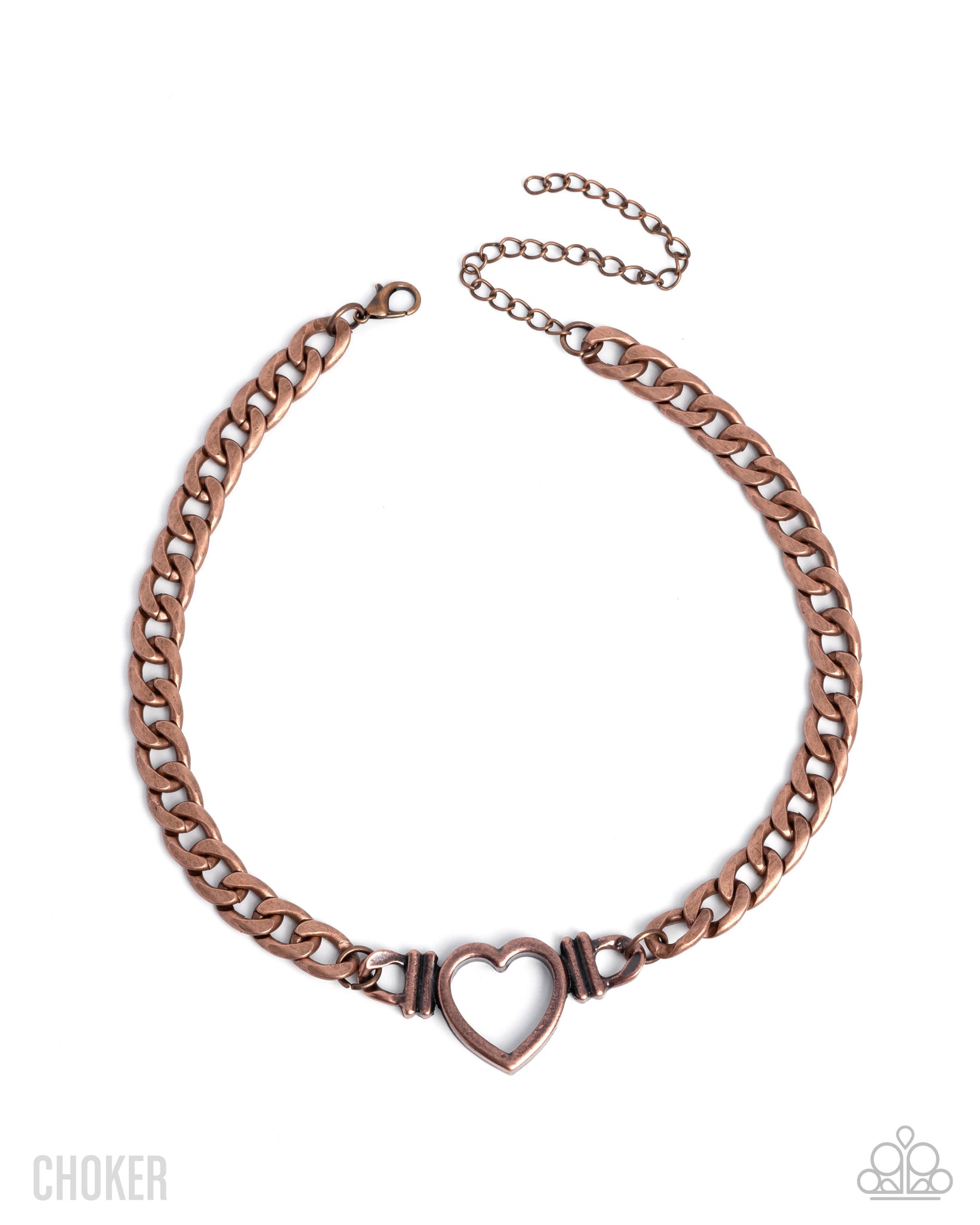 Framed in the center of a copper curb chain, a copper heart silhouette stands out atop the collar for a rustically romantic display. Features an adjustable clasp closure.