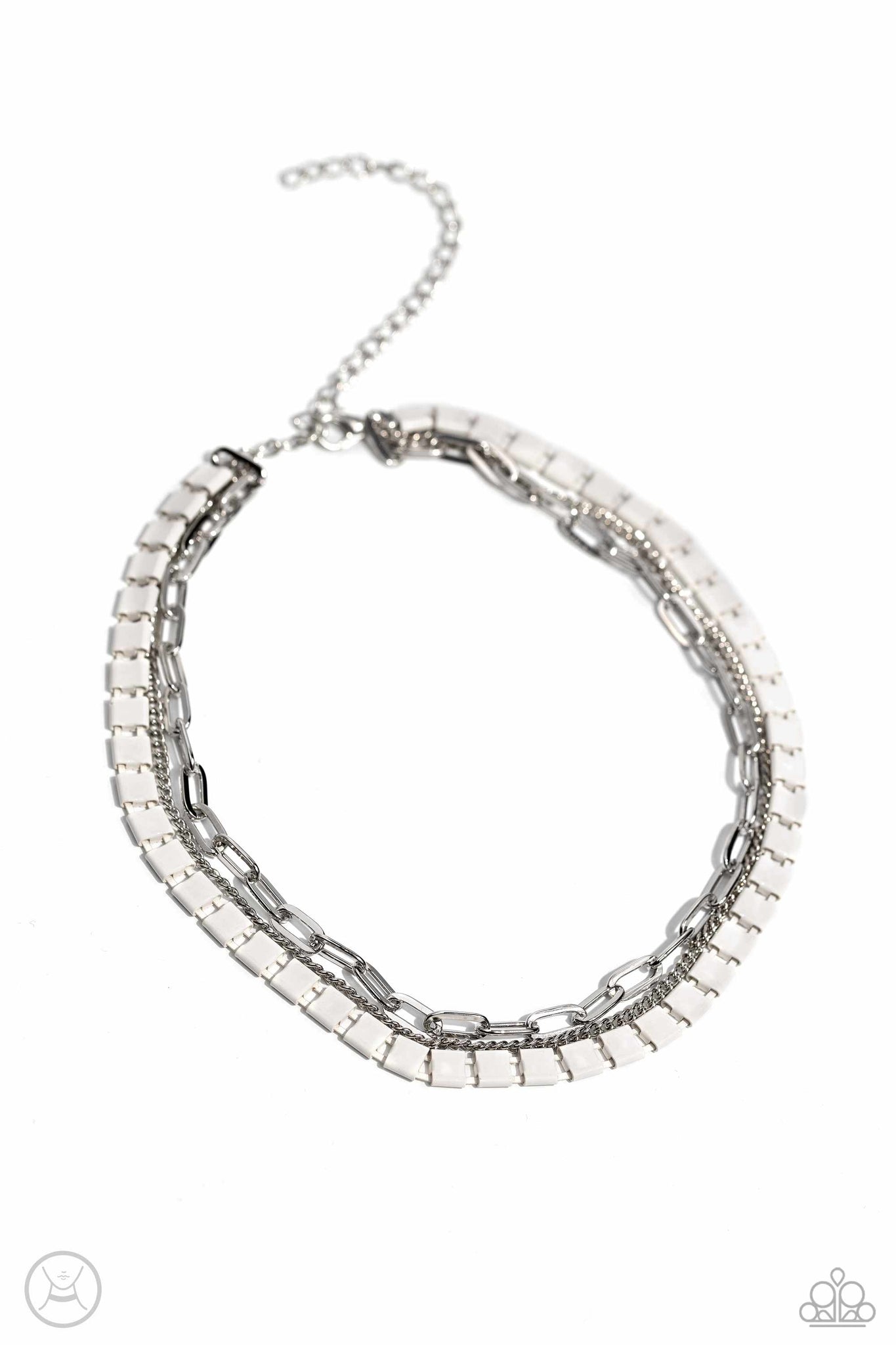 A medley of silver chains is joined by a strand of interlocking squares that are dipped in a vibrant white hue for a vibrant pop of industrial color around the collar. Features an adjustable clasp closure. Sold as one individual choker necklace. Includes one pair of matching earrings.