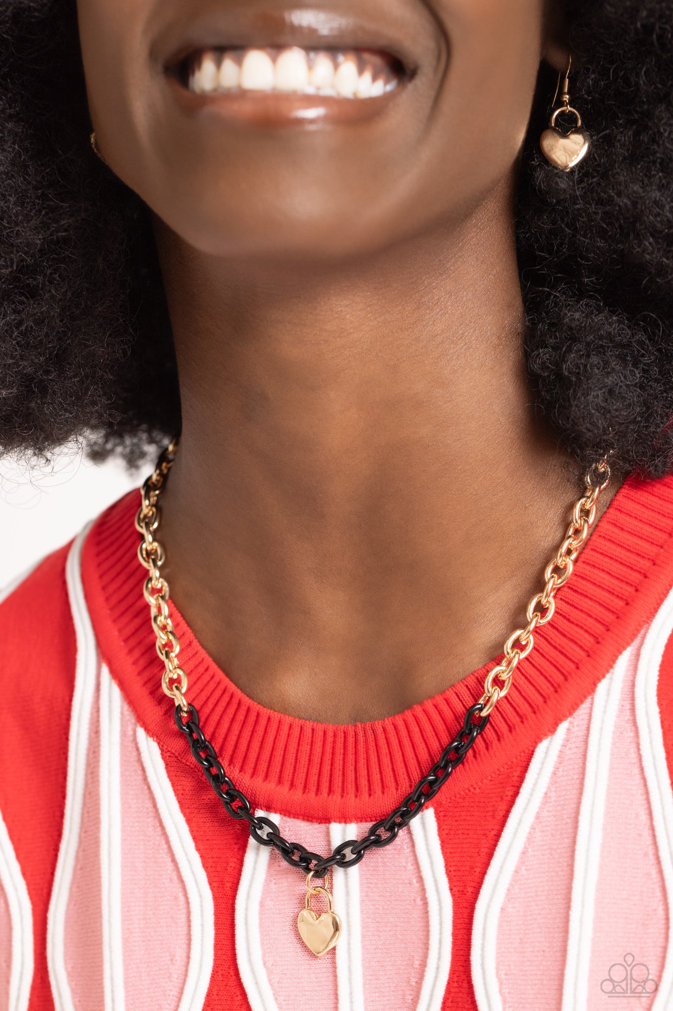 Infused with splashes of black chain, a lengthened oversized high-sheen gold chain dances down the chest for a spunky industrial statement. A dainty hammered gold lock pendant graces the bottom of the necklace, further infusing the design with a touch of romanticism. Features an adjustable clasp closure.