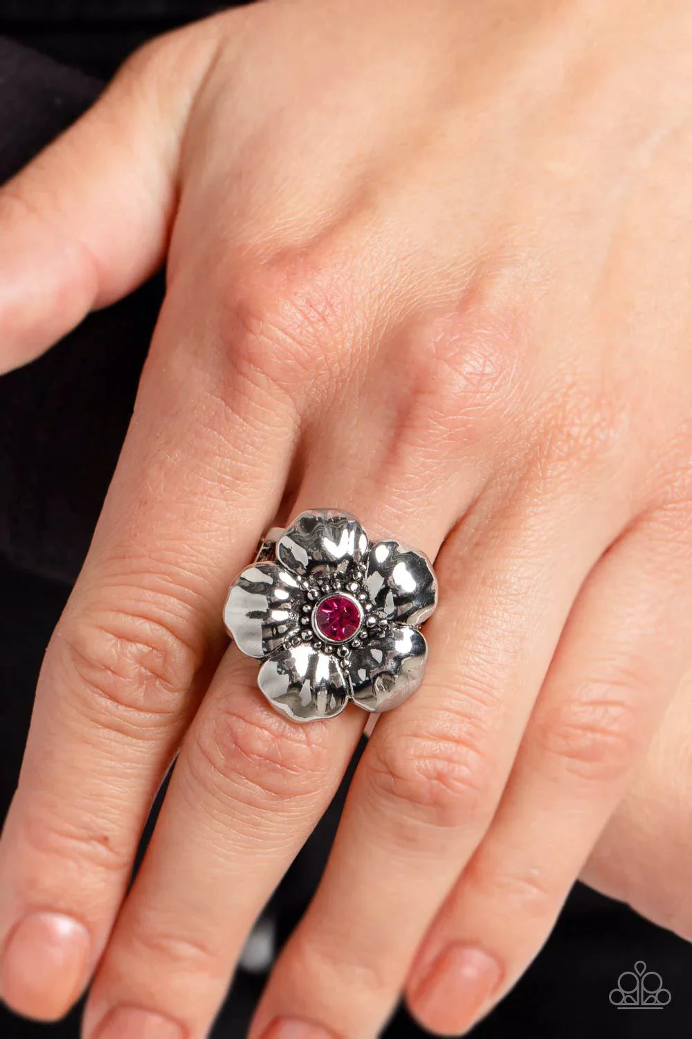 Dotted with dainty silver studs and a dainty fuchsia rhinestone center, folds of shiny silver curl into an oversized tropical flower for a whimsical dash of island inspiration atop the finger. Features a stretchy band for a flexible fit.