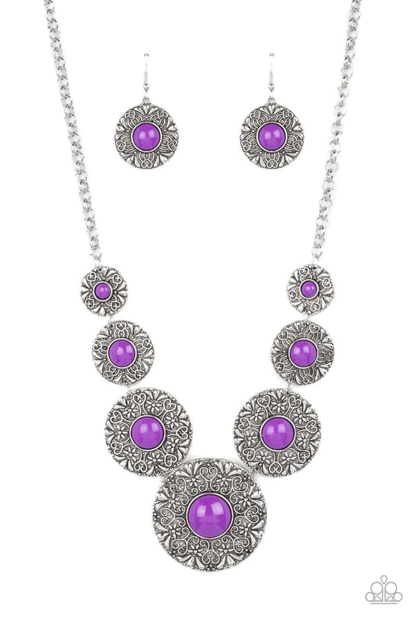 The Paparazzi Accessories Garden Glade necklace is a stunning piece that is perfect for any fashion-forward individual. The necklace features a variety of purple beads in different shapes and sizes, giving it a unique and eye-catching appearance. The beads are strung together on a durable wire and fastened with a classic silver clasp.