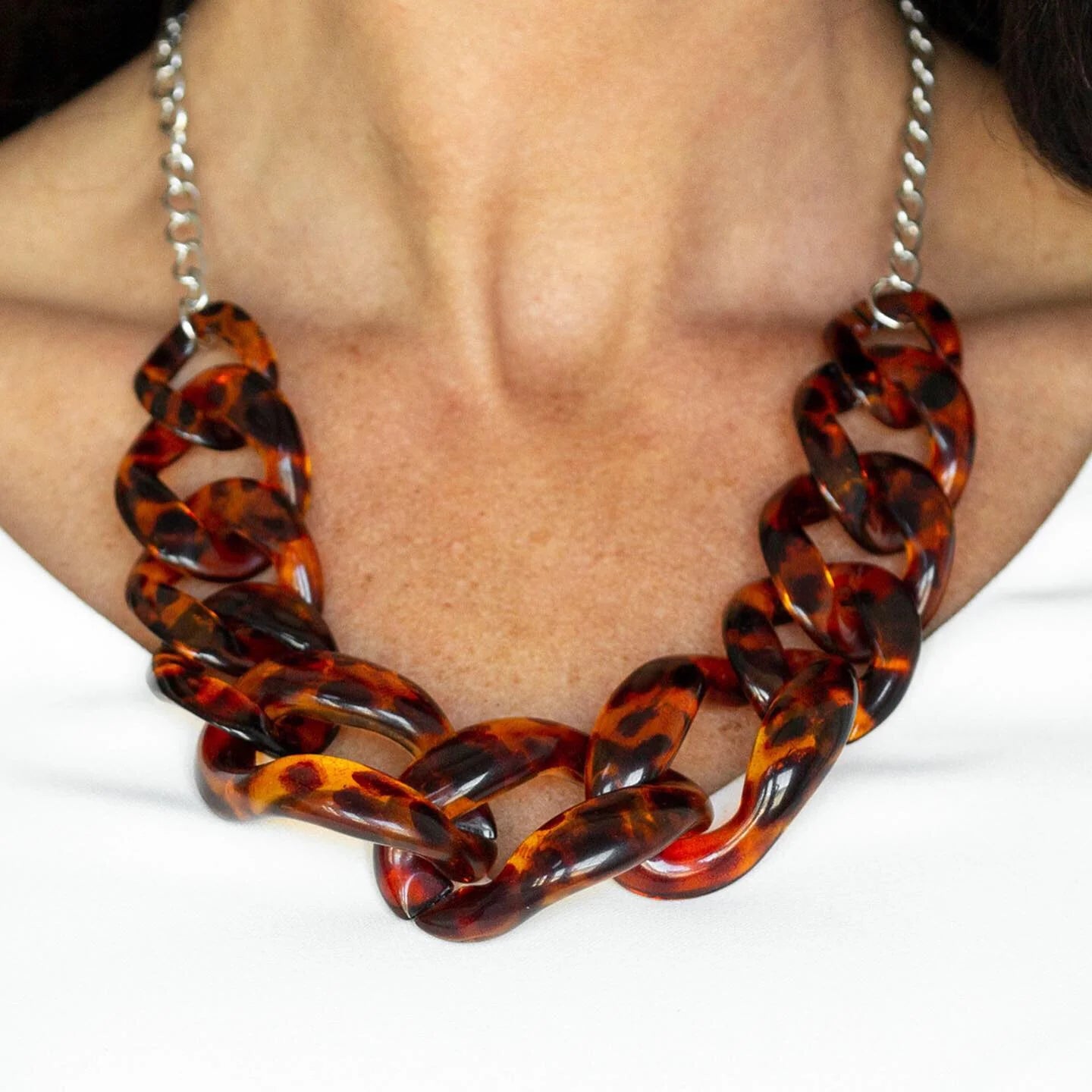 Featuring a tortoise shell finish, brown acrylic links gradually increase in size as they link below the collar in a statement-making fashion. Features an adjustable clasp closure.