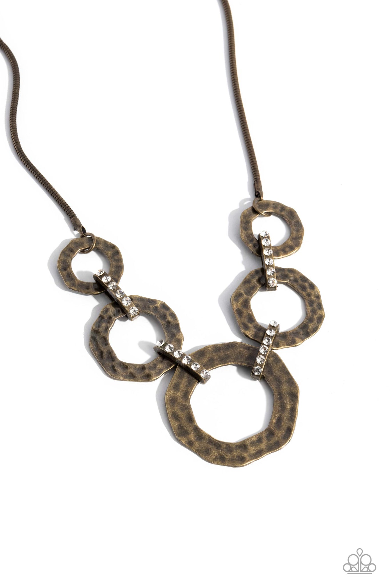 Featuring an antiqued finish, a hammered collection of brass hoops coalesces down the neckline from a brass snake chain for a gritty statement. Elongated brass hoops encrusted in white rhinestones interconnect each hoop for a spritz of glitz and glam. Features an adjustable clasp closure.
